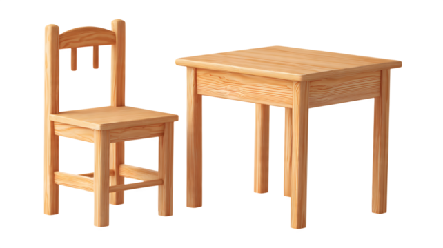 Simple and sturdy wooden table and chair set crafted from light-colored natural pine wood isolated on transparent background