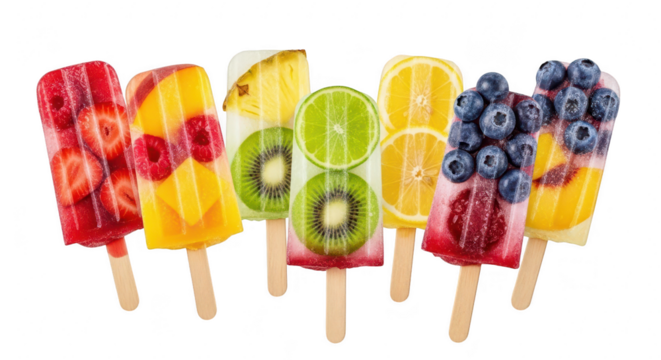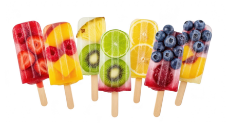 Assortment of colorful fruit popsicles isolated on transparent background