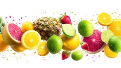 Vibrant tropical border frame with fruits and foliage on transparent background