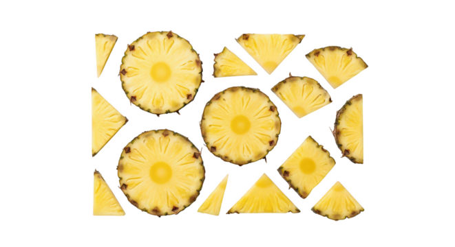 Assortment of fresh pineapple slices and wedges arranged on a white background