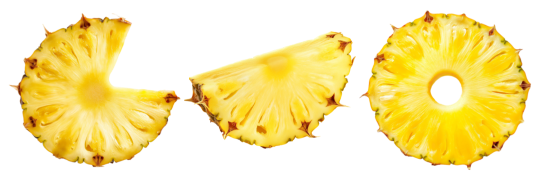 Pineapple isolated png. Pineapple slice on transparent background. Cut pineapple no background top view. Round pineapple slice and piece transparent png. Full depth of field.
