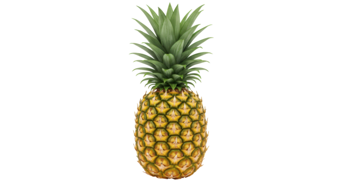 A Pineapple. An image featuring a ripe pineapple placed on a clean white background. The pineapple its unique texture crown of leaves and prickly skin standing out against the minimalist backdrop.