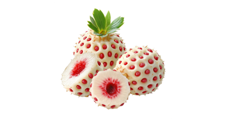 Whole and sliced pineberry with white skin and red seeds, great for hybrid fruit branding or gourmet packaging, isolated on white transparent background PNG cutout Mockup template for artwork design