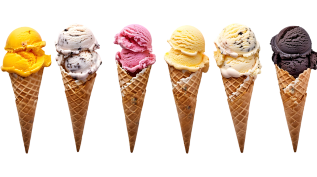 A crisp image of assorted ice cream cones, each with different flavors like mango sorbet, chocolate chip, and raspberry swirl, neatly arranged, transparent background