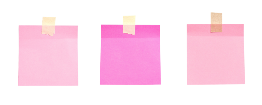 Three pink sticky notes fastened with tape, isolated on a transparent background; PNG