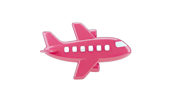 3D Cute pink airplane with blue wings and orange engines on transparent background