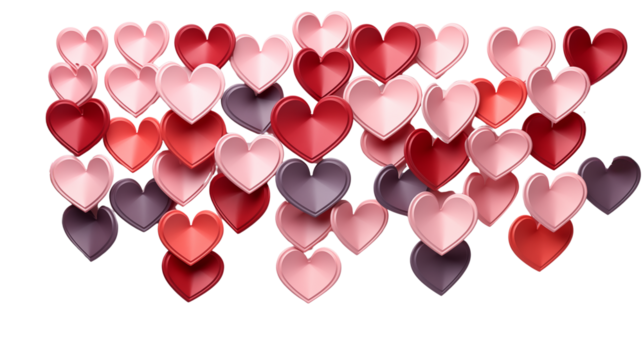 Abstract Pink Red Purple 3D Hearts Romantic Valentine's Day, studio view, isolated on transparent background.