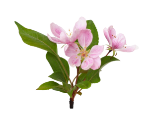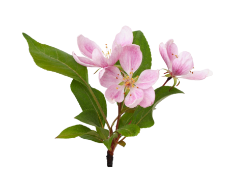 Pink flowers and green leaves of Malus floribunda (profusely flowering apple) isolated on white or transparent background