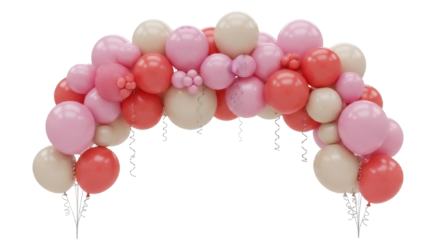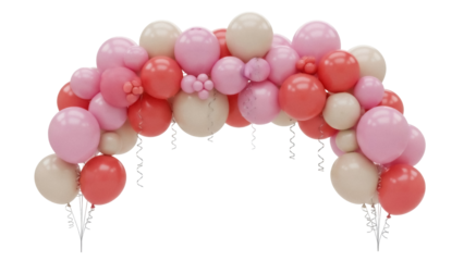 Festive balloon arch PNG isolated on transparent background, party decoration with pink, red, and cream balloons for celebration and event design