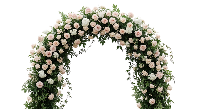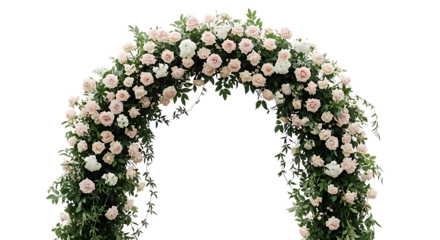 Festive arch made of pink and white balloons with roses isolated with transparent background