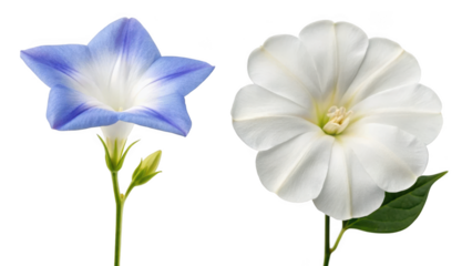 Colorful Morning Glory Flowers with Green Leaves on a White Background
