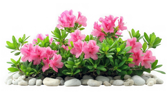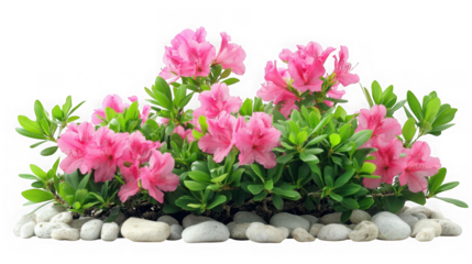 Beautiful pink azalea flowers with green leaves and white pebbles isolated on transparent background