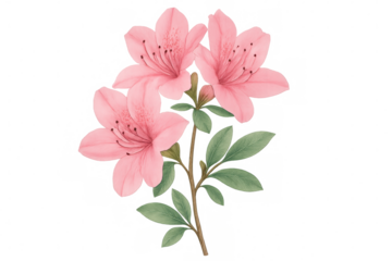 Blooming pink azalea flowers on a delicate stem, surrounded by vibrant green leaves, isolated against a transparent background