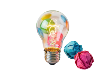 Light bulb emitting glowing light surrounded by colorful crumpled paper balls isolated PNG with Transparent Background