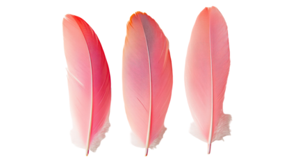 Three delicate pink bird feathers isolated on transparent background