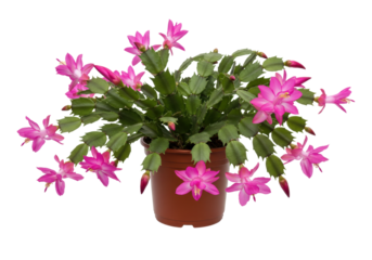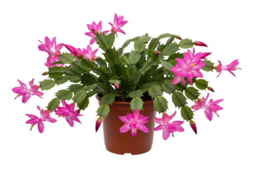 Isolated potted Thanksgiving cactus with pink blooms, a beautiful floral houseplant, flowering