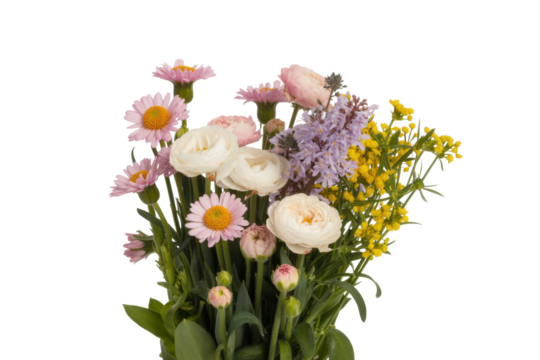 Vibrant botanical bouquet of daisies and pink blooms on transparent