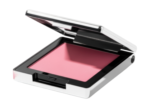 Pink blush compact with glossy metallic casing, transparent background, cutout PNG
