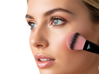 A beautiful young woman applying soft pink blush to her cheek with a professional brush