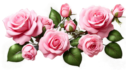 beautiful pink roses with lush green leaves, isolated on transparent background. png