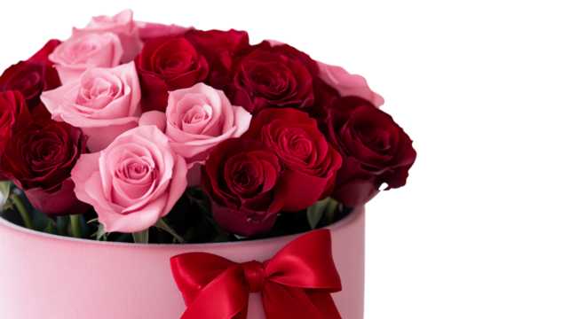 Bouquet of red and pink roses in a pink box with a ribbon, isolated on a transparent background, png image, cut out