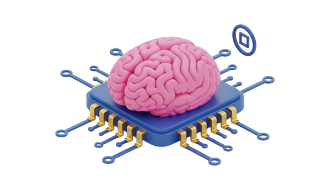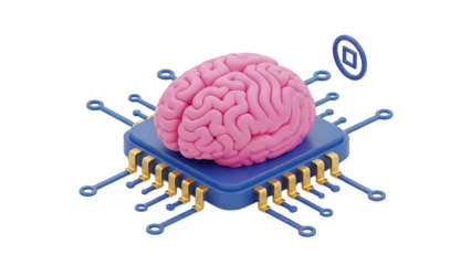 A pink brain sits on a blue computer chip with gold connectors on a black background on transparent background