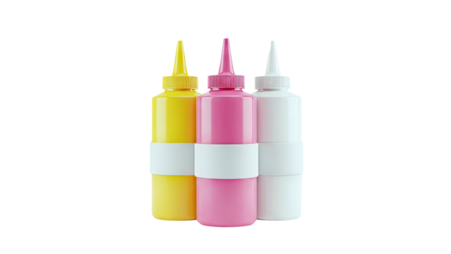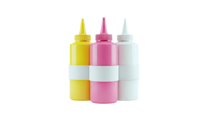 Three Squeeze Bottles with Caps in Yellow, Pink, and White