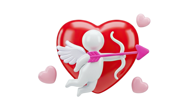 Cupid aiming arrow at a red heart with pink hearts floating around