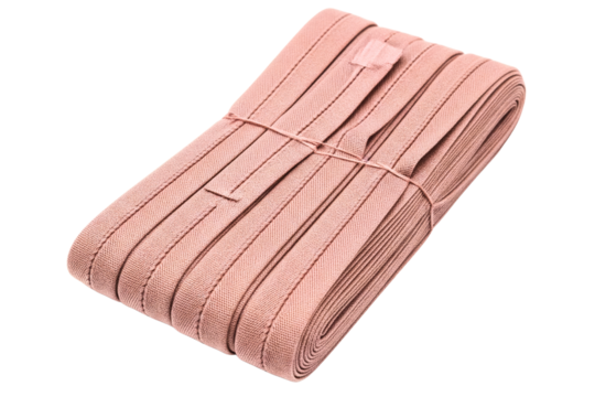 Stack of soft, white and rose-pink towels, tied with a gray ribbon