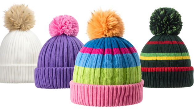 Four colorful ribbed knit beanies with pom-poms of varying hues