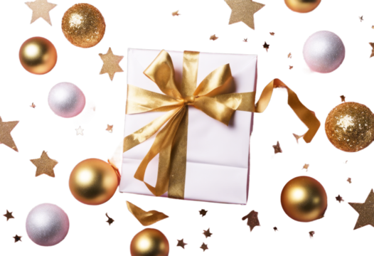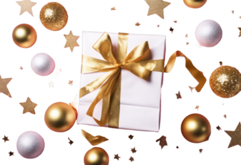 Happy top Christmas Beautiful view presents paper Festive stars lay. Holidays 2020 pink confetti golden white New decorations Flat Year bag balls background gift Merry celebration. gold