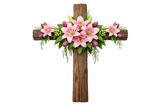 Rustic wooden cross with beautiful pink lilies and floral decor isolated on white
