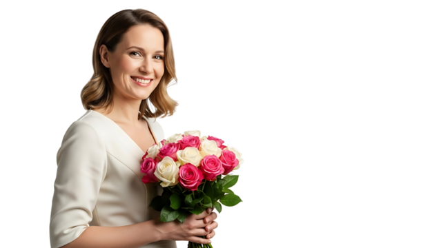 A smiling woman holding a bouquet of roses on transparent background