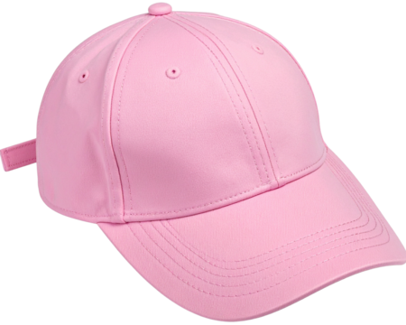 _A pink baseball cap photographed from above, rounded crown and symmetrical panels vis