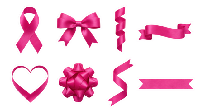 Pink satin ribbon set including breast cancer awareness loop, gift bows, curled streamers, and decorative banners isolated. Stationery and celebratory design elements.