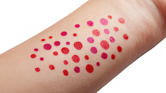 Caucasian woman showing allergy test results on her forearm, featuring various shades of red and pink dots, against a transparent background, ideal for health and beauty concepts