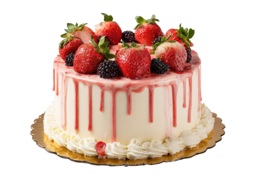 Fresh strawberry and blackberry cake with drizzled icing