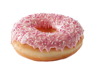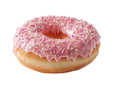 A single, whole, pink-glazed donut with sprinkles