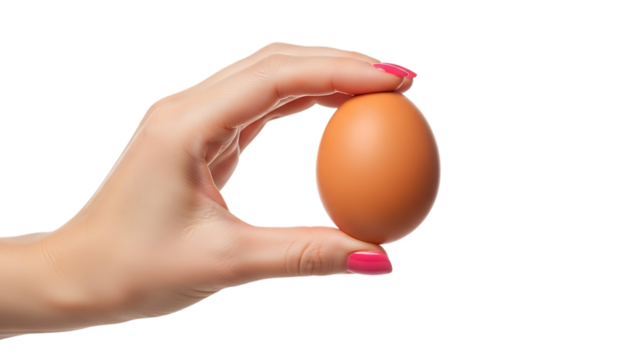 Hand holding brown egg with pink nails isolated on a transparent background fingernails