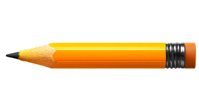 A small yellow pencil with a pink eraser is isolated on transparent background and ready to write, draw, or sketch ideas