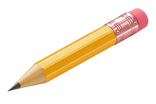 A sharpened yellow pencil with a pink eraser isolated on transparent background