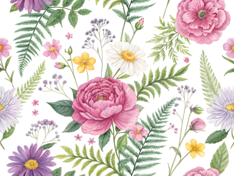 Lush watercolor floral seamless pattern with blooming pink roses, white daisies, and abundant botanical green foliage.