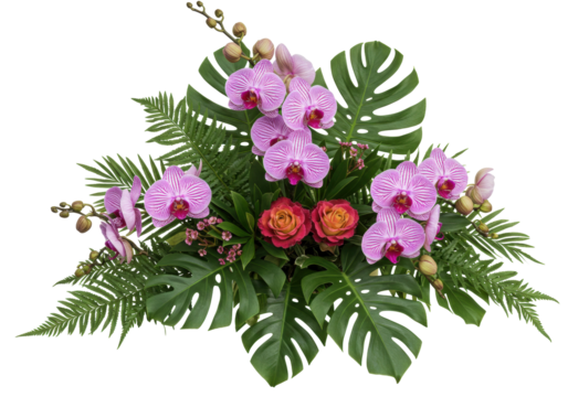Elegant floral arrangement with pink orchids and roses isolated, tropical flower bouquet for wedding decor and special occasions