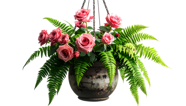 Hanging flower basket with pink roses, lush ferns, and a weathered pot, against a black backdrop
