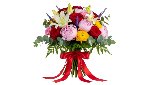 A beautiful bouquet of colorful flowers with a red ribbon on transparent background