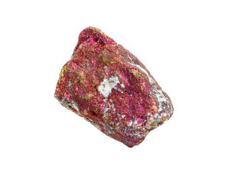 A colorful chalcopyrite mineral with golden flecks on a white isolated background, exhibiting pink iridescence and metallic sheen. Great for collectors or scientific exhibits.