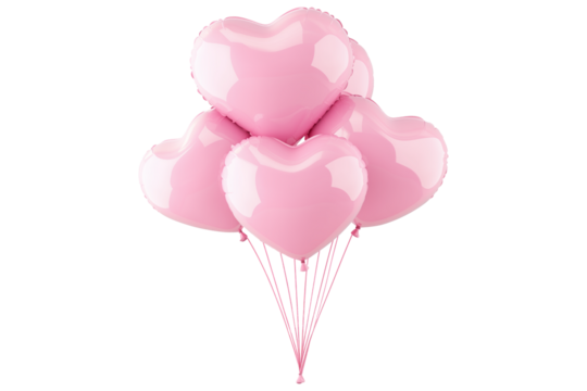 A cluster of shiny pink heart-shaped balloons floating against white transparent background, symbolizing love and celebration of Valentine Day