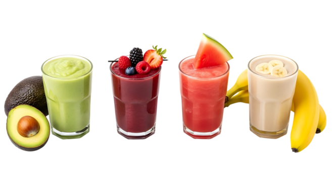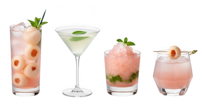 Four assorted red cocktails garnished with fruit and mint isolated on transparent background