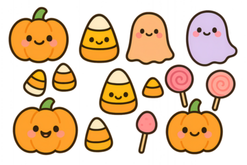 Adorable Halloween Cartoon Icons: Pumpkins, Candy Corn, Ghosts, and Lollipops