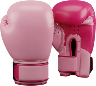 A pair of glossy pink boxing gloves rendered in 3D featuring a large light pink glove next to a darker magenta glove pink gloves combat sport fighting equipment transparent background
